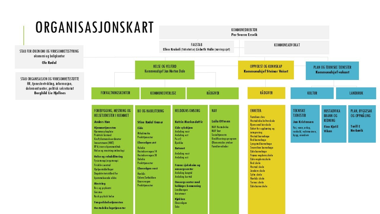 Med bakgrunn i ny kommunelov heter øverste administrative leder kommunedirektør. Hustadvika kommune er administrativ organisert i en tonivåmodell med to formelle beslutningsnivåer - kommunedirektør og enhetsledere.